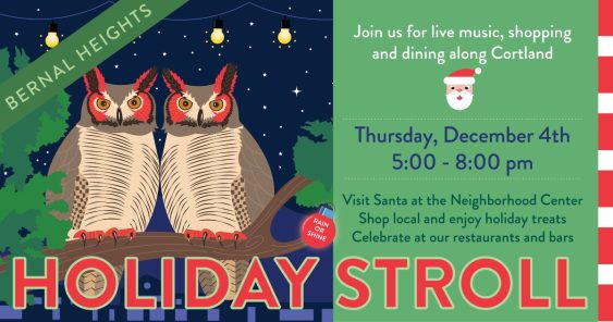Join us for our annual Holiday Stroll along Cortland on Thursday, December 4th from 5-8:00. We will have live music outside the library, Vega’s Pizzeria, Vino Rosso and a Mariachi group strolling from Seafood Station to 3rd Cousin. Santa will again be at the Bernal Heights Neighborhood Center, Or Shalom will be hosting a Hanukkah celebration and the Bernal Village Marketplace will be at Baukunst Studio. Bring your family and friends to shop and dine along Cortland and support your local small businesses this holiday season, with thanks to Avenue Greenlight for their support!