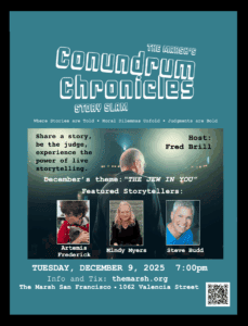 Please join us at our next Conundrum Chronicles StorySlam December 9, 7:00 pm (The Marsh Theater– 1062 Valencia Street). Throw your name in the hat for a chance to tell a true, 5-minute story, about your, or be the judge… or kick back and enjoy the transformational power of live storytelling!