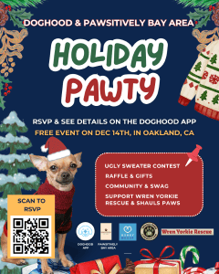 @doghoodapp and @pawsitivelybayarea invite you to a festive Holiday Pawty! Join us for an ugly sweater contest, raffles and prizes, special swag for your pups, and lots of community fun — all while supporting @WrenYorkieRescue and @shauls.paws .