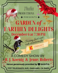 Indulge your senses in the Garden of Earthly Delights Comedy Show at Akoma. Presented by Thalia Productions, this show is packed with an all-star lineup of Bay Area leading comics including R.J. Koenig, Jenny Roberts, Maggie Adams, Yi Ma, and Sarah Shaughnessy. Comedic heavyweights Brian Clune, TK Moyer, Spencer Devine, and Bailey Miller will compete for the title of the Holly Jolliest Santa. Audience voting will decide the winner! Don’t miss out on this unforgettable evening of delightful comedy and inspired indulgence at Akoma!