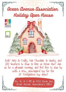 Holiday Open House on Dec 11, 4–5 PM at 1720 Ocean Ave. Crafts, hot chocolate, snacks, and $10 vouchers. Questions: events@oaacbd.org