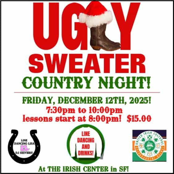 Y’all are invited to a boot-scootin’, jingle-bell rockin’ Country Dancehall Friday Night at the United Irish Cultural Center with Line Dancing Lisa & DJ Shivers! ✨