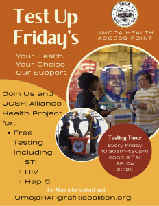 Join us and UCSF: Alliance Health Project for free STI, HIV, and Hep C testing every Friday at Umoja HAP!