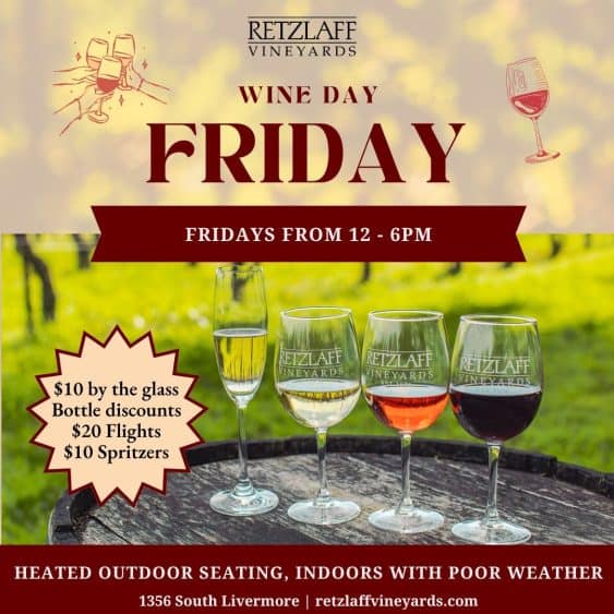 It’s Wine Day Friday at Retzlaff Vineyards — your well-earned Friday attitude adjustment among the vines! All day Happy Hour pricing: sip $10 wines by the glass, enjoy $20 tasting flights, refreshing $10 wine spritzers, and other wine specials. Open until 6pm.